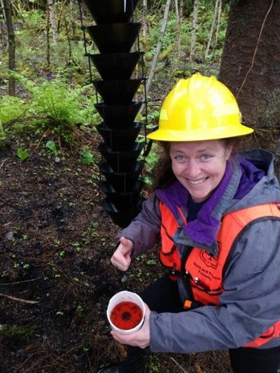 On the banks of Juneau’s Montana Creek, Claire Delbecq leans over a small metal strainer, sorting through the plant matter, insects, and sediment that have been collected from the water column of the nearby stream. The contents of this sample can tell us about where and when salmon are getting their food, and how altered patterns of stream flow due to climate change might affect their growth.