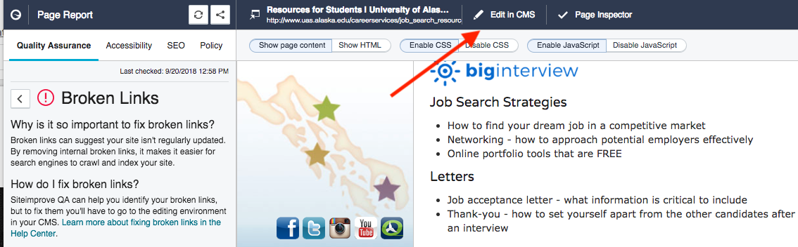 - Now that you know where the error is, how do you fix it? At the top of the screen is a button to edit in CMS. Once you click this button, the page should open in the CMS.