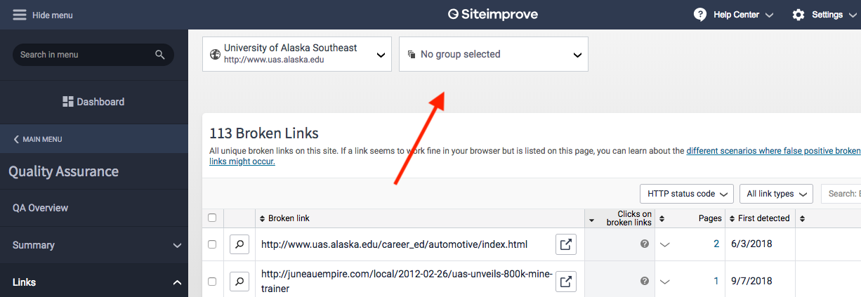 - Clicking "Pages with Broken Links" in the "Links" submenu opens a page with a list of broken links. If you do not see anything on this page, you may be a part of multiple Siteimprove groups. In the top of the screen, please select a group from the dropdown menu.